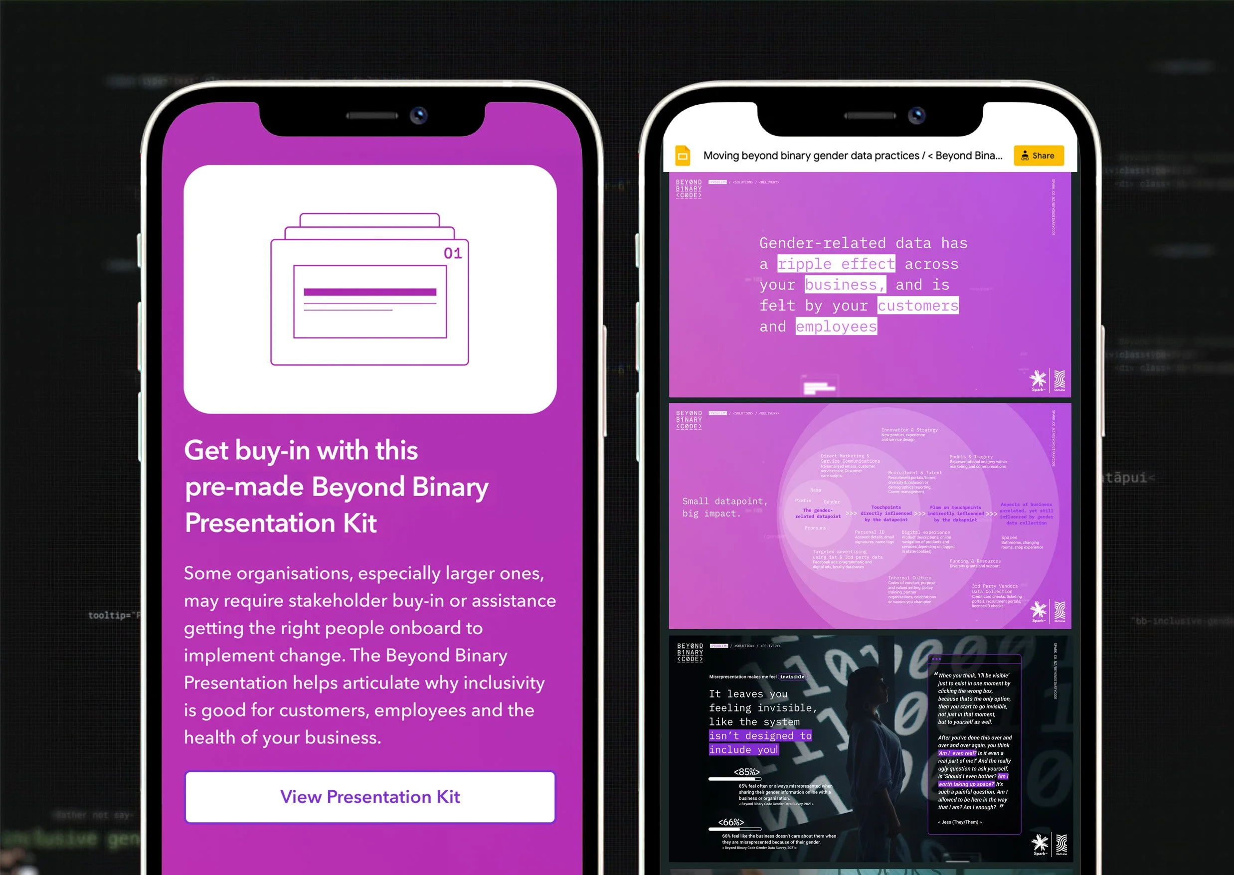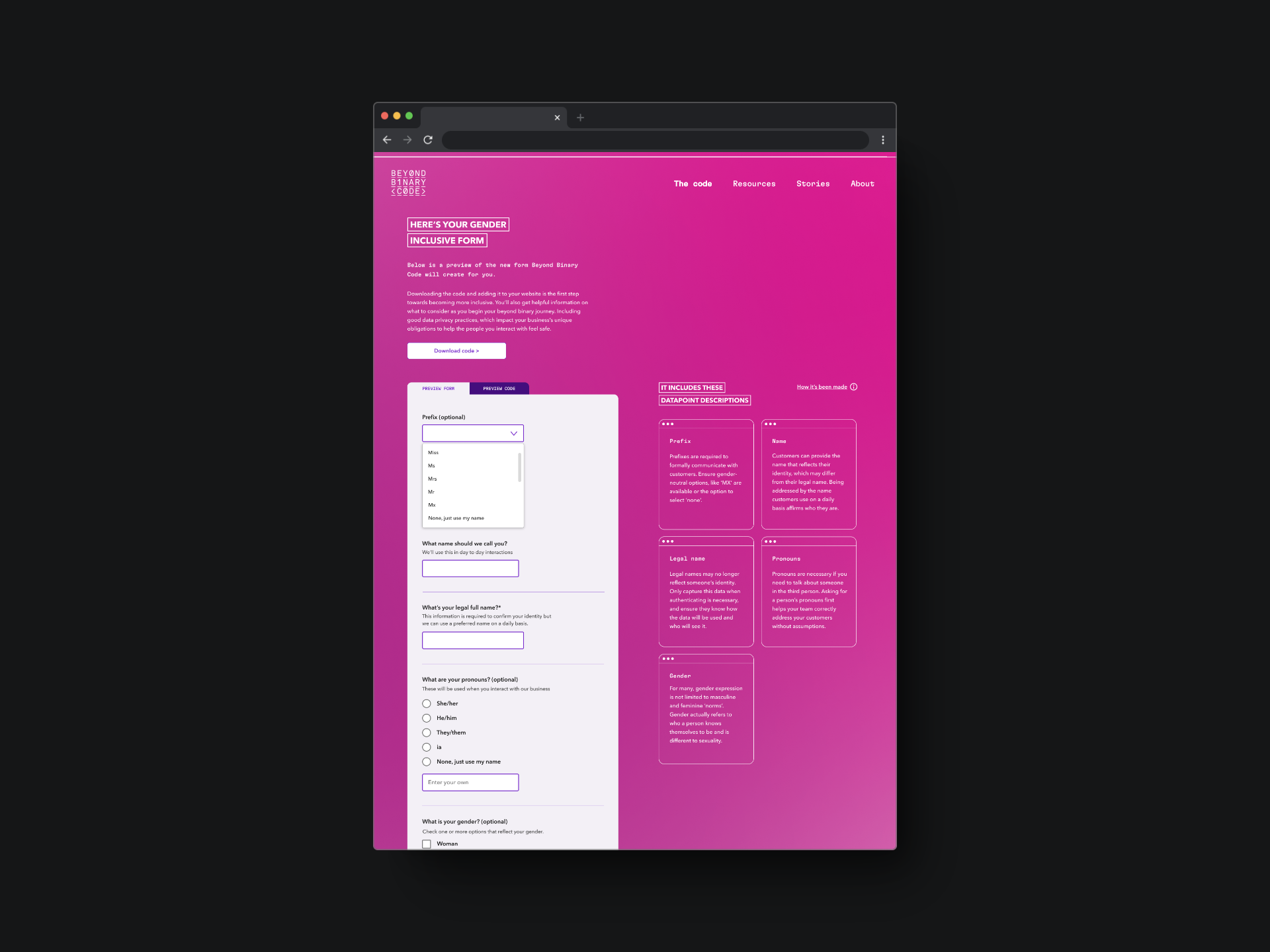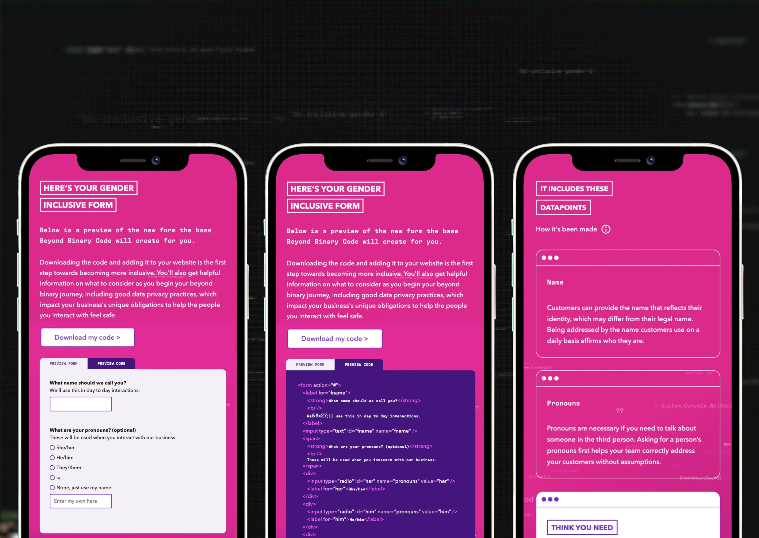 Beyond Binary Code is a single piece of code that can be added to any website, instantly updating gender forms and fields to be inclusive. The code and accompanying resources enable businesses to see, understand and genuinely engage with the trans and non-binary community for the first time through accurate data.